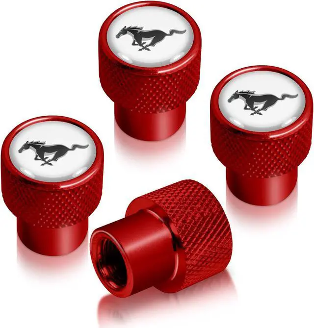 Ford Mustang Logo in White on Red Aluminum Tire Valve Stem Caps