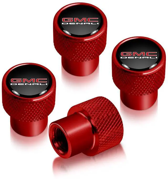 GMC Denali Nameplate in Black on Red Aluminum Tire Valve Stem Caps