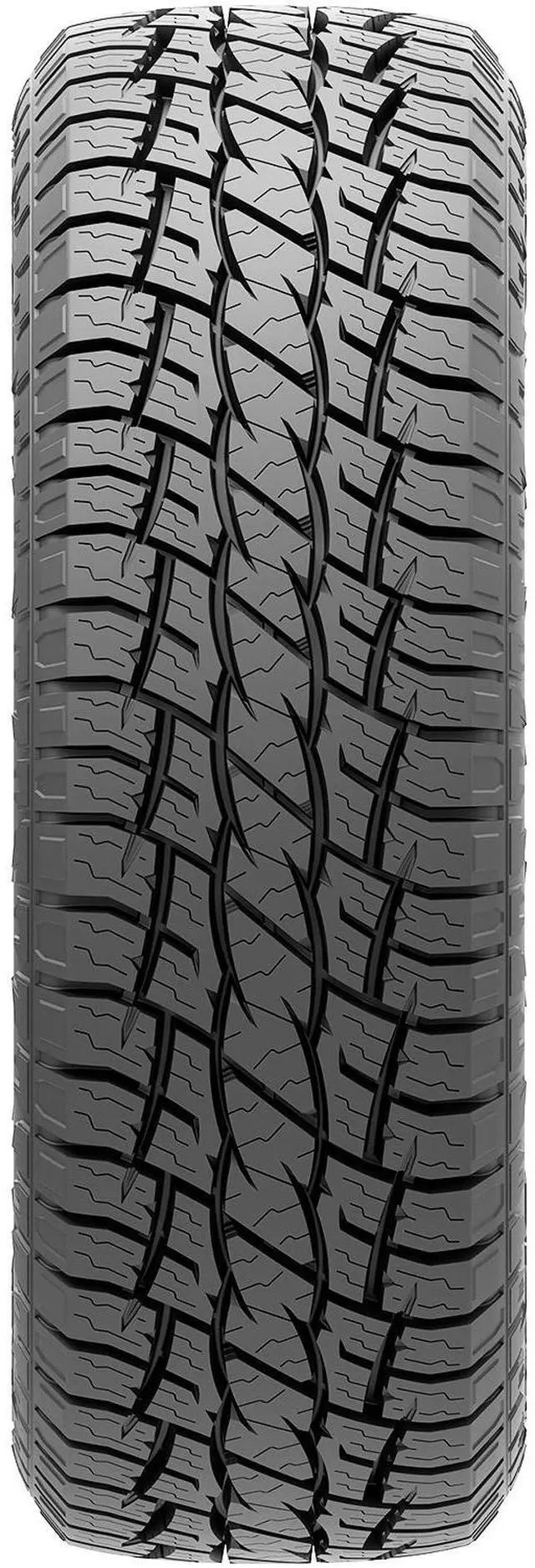 The optimized grooves eliminate water and slush from the footprint, preventing hydroplaning. They also clean mud and rocks from the footprint to avert blocking its surface contact and minimizing tread damage. A radial construction strengthens the model from within, providing flexing resistance and improving the overall stability. In addition, the A/T features a particular tread design that guarantees consistent surface contact, which enhances controllability and maneuvering.