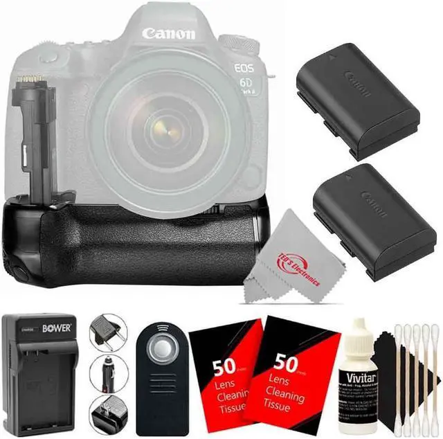 Includes a secondary shutter and on/off button for easy convenience. Rubberized grip for easy handling & protection Compatible only with a Canon EOS 6D Mark II Camera Able to install one or two batteries for more effective shooting time The Replacement Battery for Canon LP-E6 Replaces the Canon LP-E6 Provides excellent battery life and boasts 7.4V and 1700 mAh High-capacity energy storage 100% memory-free for easy charging at any energy level Can be used with original lithium-ion battery charger