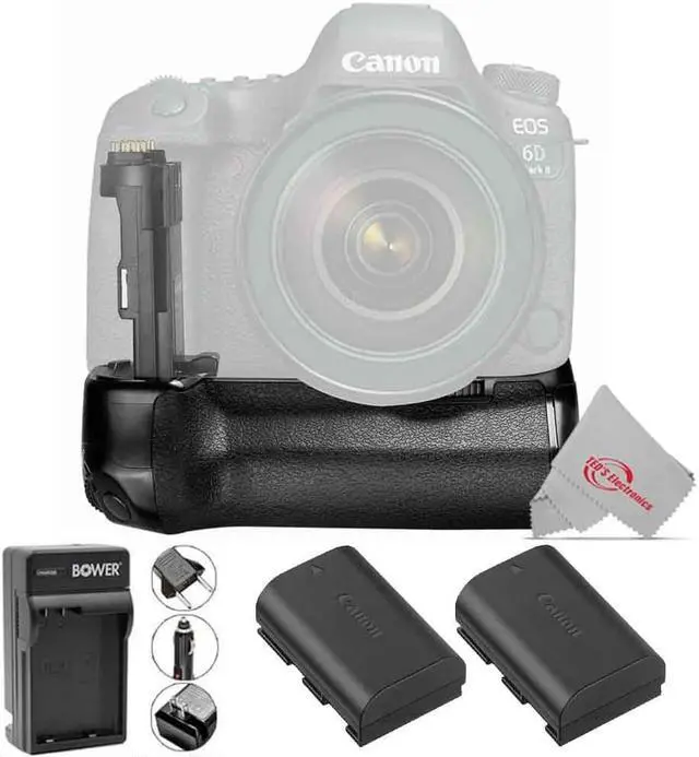 Includes a secondary shutter and on/off button for easy convenience. Rubberized grip for easy handling & protection Compatible only with a Canon EOS 6D Mark II Camera Able to install one or two batteries for more effective shooting time The Replacement Battery for Canon LP-E6 Replaces the Canon LP-E6 Provides excellent battery life and boasts 7.4V and 1700 mAh High-capacity energy storage 100% memory-free for easy charging at any energy level Can be used with original lithium-ion battery charger LP-E6 Replacement Charger for Canon Individual battery charger for LP-E6 digital camera battery Rapid-charge technology shortens charge time significantly Compact, durable and lightweight for easy storage