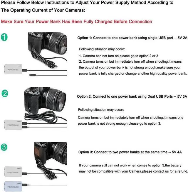 Dual USB connector can connect to 2 power pack at the same time provide stronger and stabler power for your camera.