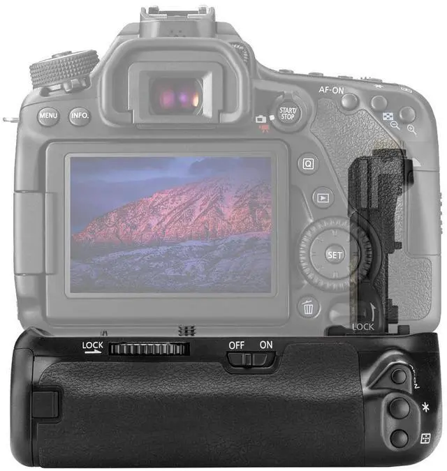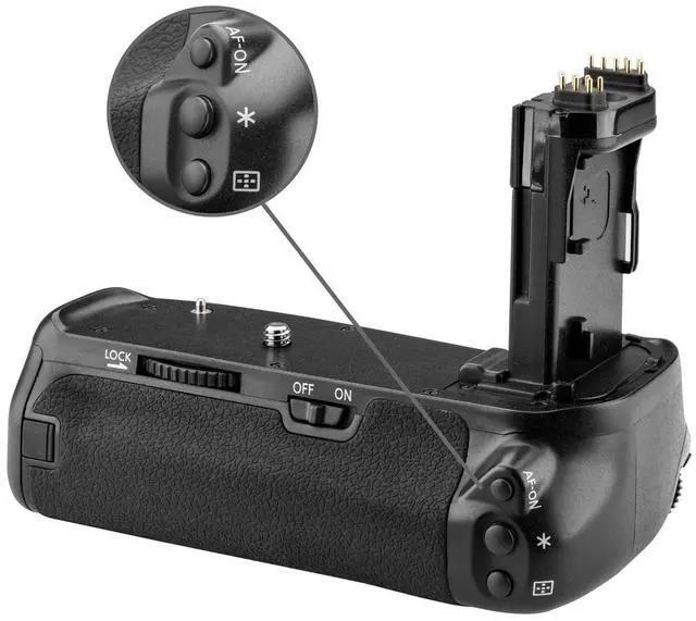 The non-slip rubberized grip offers perfect balance in any direction with full vertical shooting controls, which can be independently turned on or off as the photographer needs to enhance camera handling, especially for shooting vertical pictures - not videos, please. The grip has generous operating controls as well: shutter button, Main Dial, multi-controller, AF point selection button, AE lock/FE lock button, AF start button, and multi-function button. The base of the grip has a standard 1/4-20 tripod socket and a hand strap mount. Your camera's original battery door fits snugly in a protective hidden slot for instant retrieval.