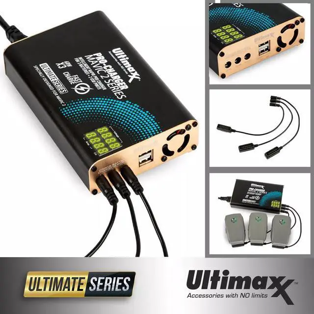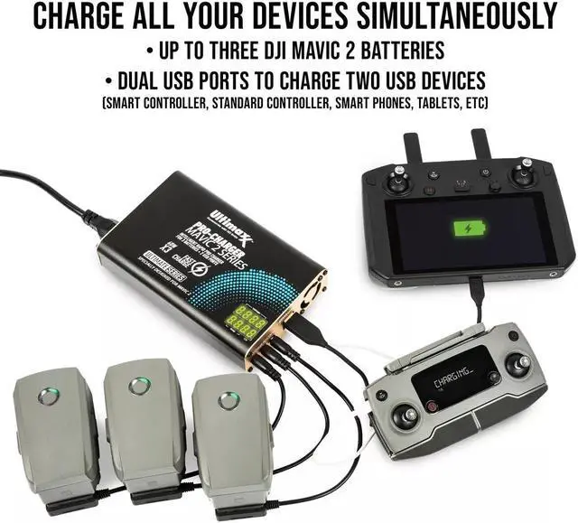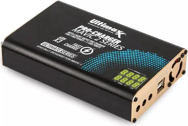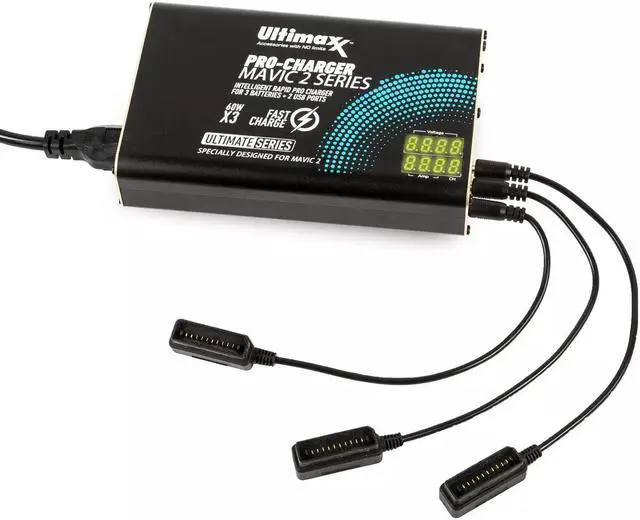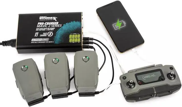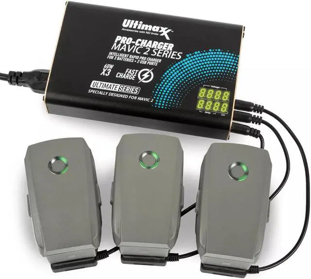 Ultimaxx Mavic 2 Intelligent Rapid Pro Charger Hub. Can charge 3 batteries at one time and 2 USB devices, ~50-60 minute charge time for batteries and 2A usb output.