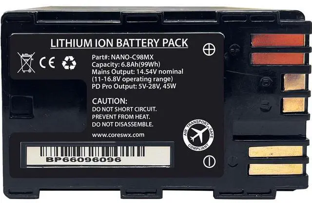 Core SWX. This compact and versatile battery boasts a 6600mAh capacity and has an integrated ring LED gauge that provides battery status data. A built-in 1/4"-20 thread provides flexible mounting options. As part of the cutting-edge Nano M-Snap Series, this battery introduces magnetic snap-charge technology, enabling seamless stacking and charging through a single PDPro USB-C PD connection, regardless of mount or voltage type. With advanced outputs, robust capacity, and a feature-packed design, this battery goes beyond traditional expectations to meet the demands of professional shooters. A high-powered USB-C port that delivers a substantial 45W of power means faster charging for a wide range of modern devices, making it ideal for today's tech-savvy users. The port can be used to charge laptops, mobile devices, and even to recharge the battery itself. Bundle with Core SWX XPD-45 Universal 45W USB-C PD Wall Charger with Cable