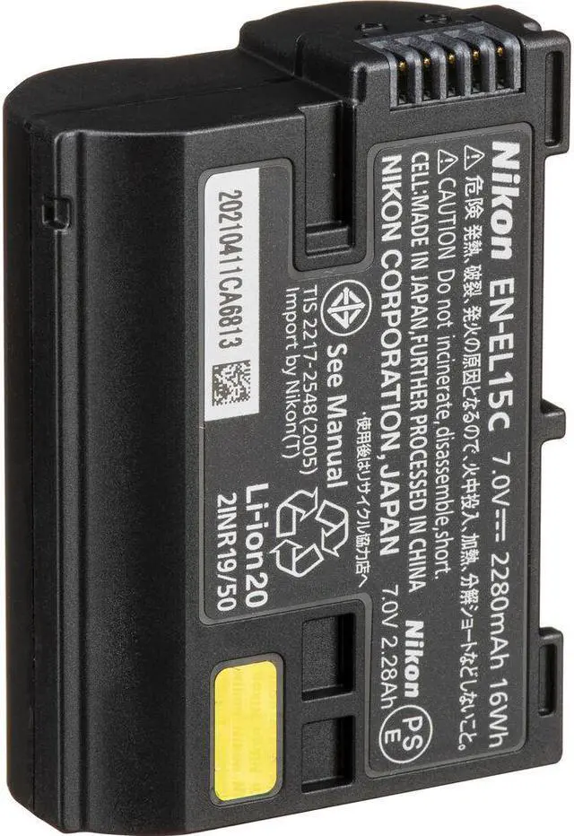 Power select Nikon cameras with the EN-EL15c rechargeable lithium-ion battery. This battery has the EN-EL15 form factor and can be used as a higher capacity substitute for previous generation batteries. It is compatible with the MH-25 and MH-25a chargers, or, when used with Z cameras, it can be charged in-camera using the EH-7P Charging AC Adapter.