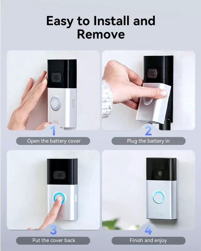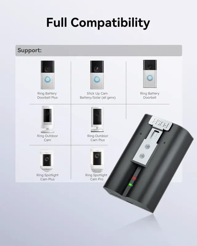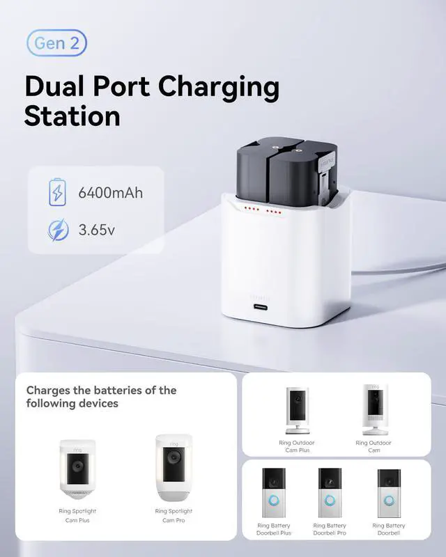 Rechargeable Batteries for Ring Battery with Charger Station - 3.65V 6400 mAh High Capacity Low-Self Discharge (2-Pack) Enhance the performance of your Ring devices with our high-capacity rechargeable batteries specifically designed for Ring cameras and doorbells. This 2-pack of Ring battery replacements is perfect for Ring Camera Doorbell 2, Doorbell 3, Doorbell 4, Stick Up Cam, and Spotlight Cam, ensuring you never run out of power when you need it most Featuring a robust 3.65V 6400 mAh capacity, these Ring batteries deliver long-lasting energy without the worry of frequent recharging. Designed with low-self discharge technology, our batteries maintain their charge longer, meaning your Ring camera or doorbell is always ready to capture important moments The included charger station makes recharging simple and efficient. Just place your Ring battery in the dock, and let it recharge quickly so you can get back to monitoring your home. Whether you have a Ring peephole camera or any other compatible device, this versatile solution guarantees reliable power and peace of mind Make the smart choice for your home security Perfect for anyone looking for a dependable ring battery 2 pack, these replacements are essential for every Ring camera and doorbell owner