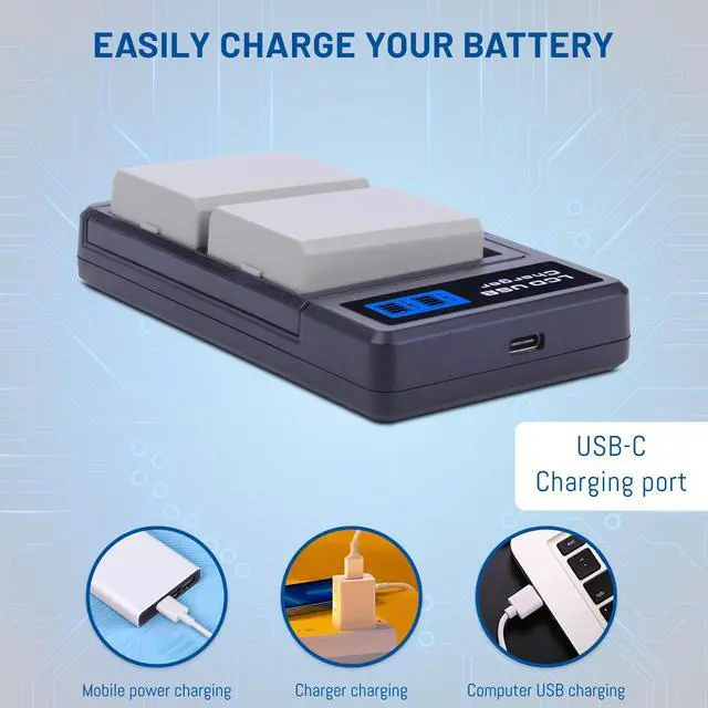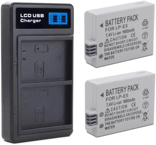 Package Includes: 2 x Replacement LP-E5 batteries, 1 x Smart LCD Display Dual Charger, 1 x Type-C Charging Cable