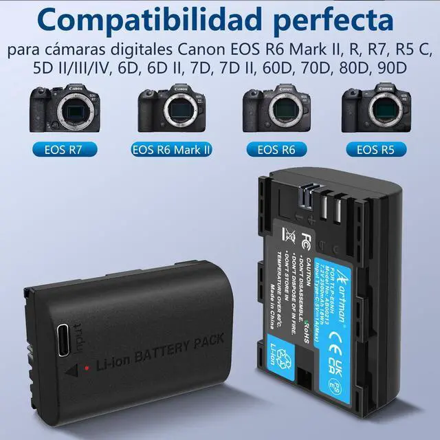 LP-E6NH Battery 2-Pack 2500mAh with Type-C Charging Port for Canon EOS R, R5, R6, R7, 5D 6D 7D Mark II III IV, 90D, 80D, 70D Cameras