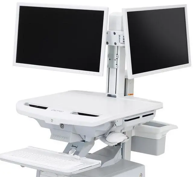 Give your medical cart dual-monitor capability. This kit converts a StyleView cart so it holds two screens. The lift engine features 5" (13 cm) of height adjustment, while the hinged bow allows side-to-side motion of either screen: position both screens forward or share a view to the left or right.