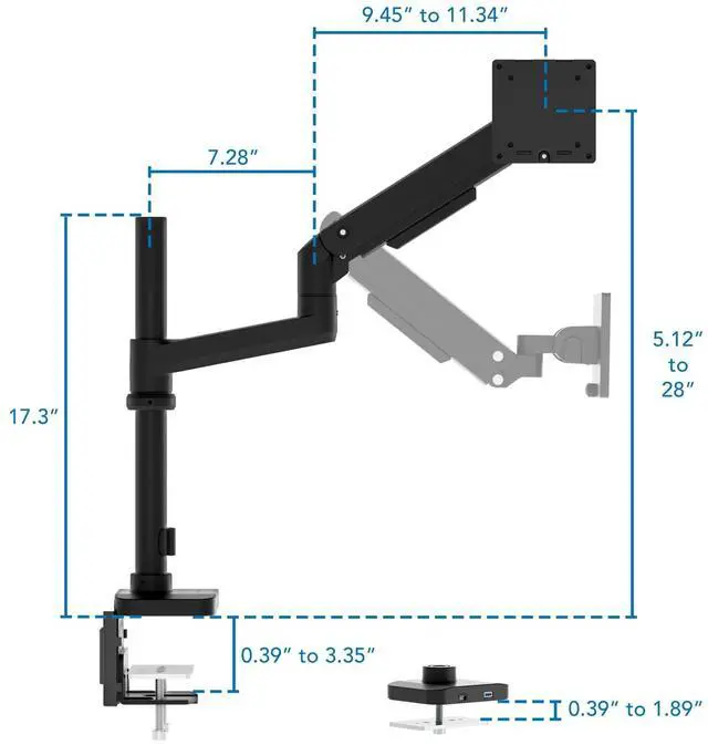 The ProFlex Series Heavy-Duty Monitor Mount is designed for professionals who need maximum screen space without sacrificing desk real estate. Supporting screens up to 49 - ultrawide monitors included - this monitor desk mount creates a productive workspace, ideal for trading, content creation, coding, and after-work gaming. The 17.3 pole provides a stable, height-adjustable foundation, while the gas spring arm delivers smooth full-motion adjustments for the perfect viewing angle. Built from high-strength steel and aluminum, this heavy-duty mount holds up to 44 lbs, ensuring rock-solid stability for even the largest displays. The integrated USB 3.0 and USB-C ports offer convenient device connectivity, while the cable management system keeps your setup clean and organized. With both clamp and grommet mounting options included, it fits desktops from 0.4 to 3.35 thick, making it a versatile choice for home offices, professional workstations, and high-performance gaming setups. Upgrade to ProFlex today and experience superior ergonomics, increased productivity, and an ultra-modern workspace!