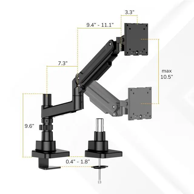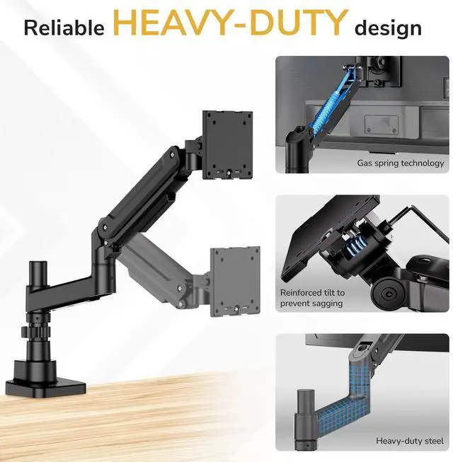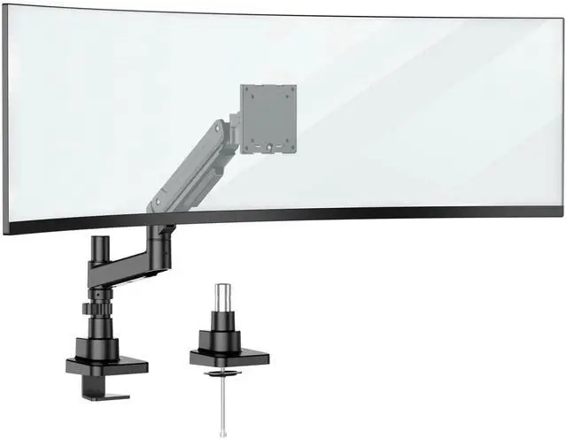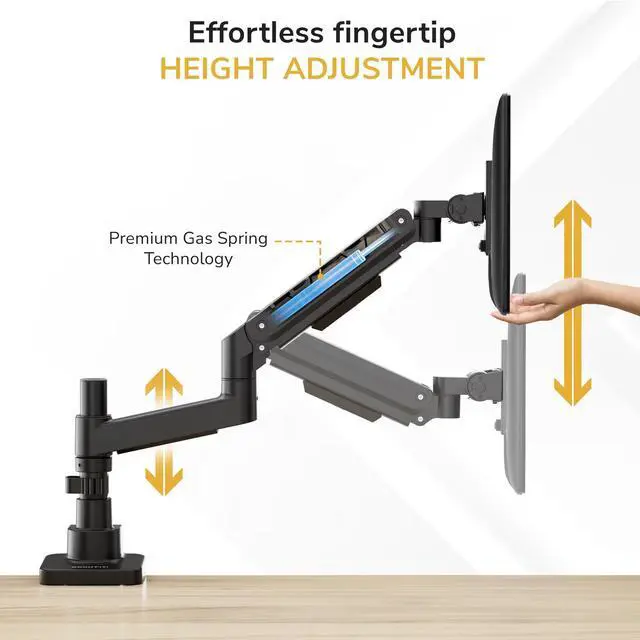 This heavy-duty single monitor mount brings industrial-grade strength and smooth adjustability to large and ultrawide screens. Designed for standard and curved monitors from 24" to 49" and weighing up to 44 lbs, its a versatile choice for professionals, gamers, and creators who rely on expansive displays. The gas-spring arm offers effortless fingertip height adjustment keeping your setup ergonomic and comfortable all day. The top-mount clamp installs entirely from above the desk, making it far easier to mount in tight spaces, eliminating the need to reach underneath during setup. It works well with desks placed flush against walls, while maintaining a clean underside for cable trays or accessories. Enjoy complete flexibility with ±180° arm swivel, a tilt range of of up to 20° down and 50° up, ±180° screen rotation, as well an extension range up to 26.4". A precision tilt mechanism ensures stable positioning and prevents sagging even with heavier monitors, so your screen stays exactly where you want it. Compatible with VESA 75x75 mm and 100x100 mm mounting patterns, this heavy-duty monitor arm delivers reliable performance and modern ergonomics.
