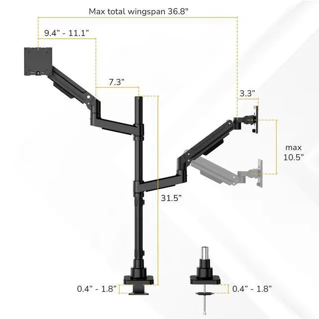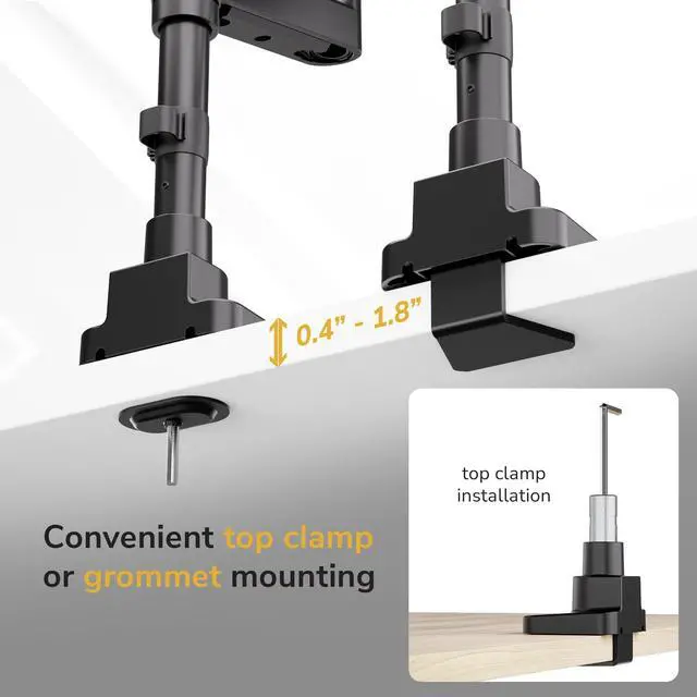 This Dual Monitor Desk Mount offers powerful performance and ergonomic flexibility for professionals who need more screen space. Built from durable aluminum and steel, this dual monitor arm supports displays from 24" to 49" in stacked setups or from 24" to 35" side-by-side, each weighing up to 44 lbs. With full tilt (-20°/+50°), swivel (±90°), and screen rotation (±180°) adjustability, it provides smooth movement for a comfortable ergonomic monitor setup that can help reduce eye and neck strain. The 31.5-inch long pole delivers ample vertical range for flexible screen positioning, while the heavy-duty tilt mechanism keeps even large ultrawide monitors securely in place without sagging. Ideal for anyone who will benefit from increased screen real estate, from office workers, gamers, and content creators, to programmers, and financial professionals, this stacked dual monitor stand helps organize your workspace and maximize productivity. The VESA-compatible (75x75, 100x100) design fits most popular monitors, and the dual mounting optionstop-clamp and grommetallow quick, stable installation on nearly any desk. Whether youre editing, streaming, coding, or trading, this adjustable monitor mount provides the perfect solution for a clean, efficient, and professional setup.