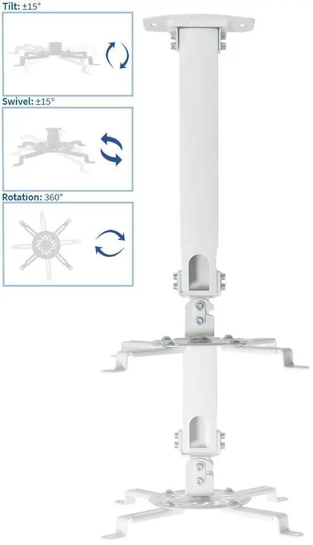 - Includes 15 degree tilt, 15 degree swivel, and 360 degree rotation to maximize projection angles.