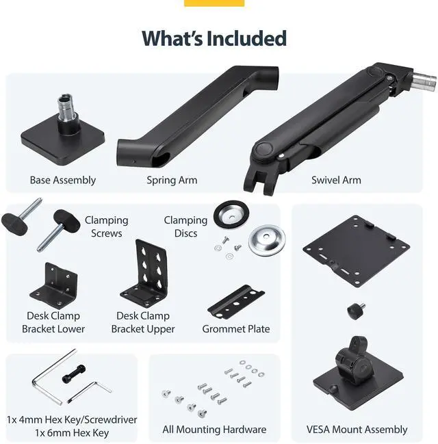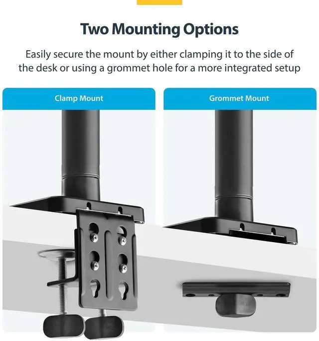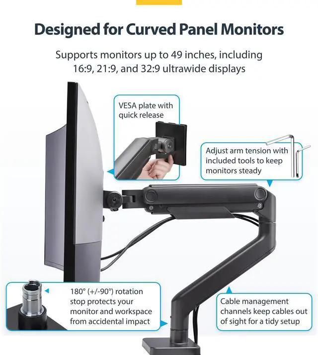 StarTech Monitor Desk Mount for up to 49in 32:9 Ultrawide Curved Screens, Mechanical Spring Arm, C-Clamp/Grommet, Tool-Less Adjustment, Max 44lb/20kg - H1M1AG1-MONITOR-ARM