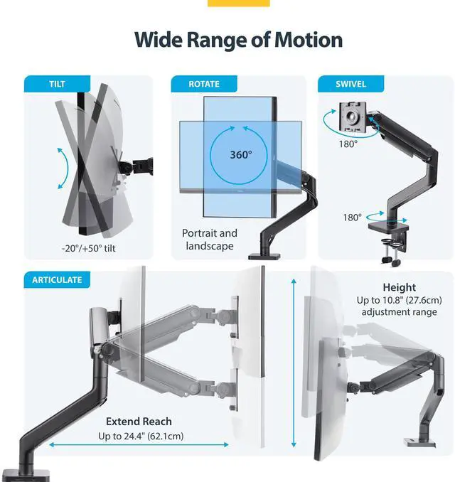 Monitor Desk Mount for up to 49in 32:9 ultrawide curved screens - VESA 75x75/100x100 - Mechanical spring arm w/toolless adjustments +/-90 deg swivel; -20/+50 deg tilt; VESA 360 deg rotation - Arm height range 20in; C-clamp/grommet - Max weight 44lb