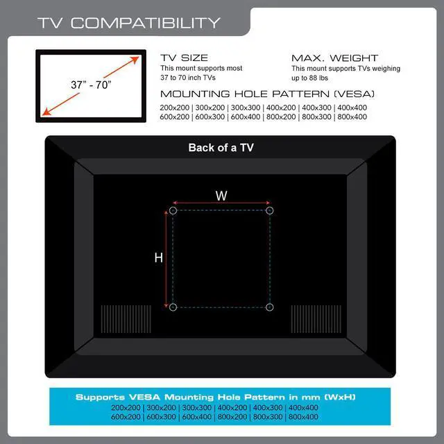 1. Size of TV: Supports most 37 to 70-inch TVs.