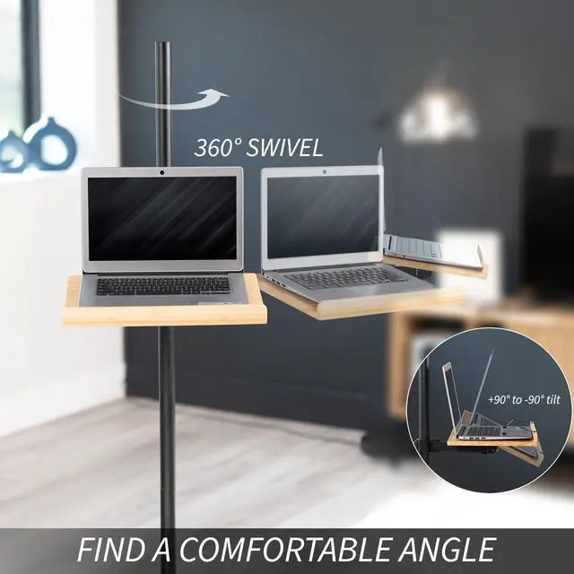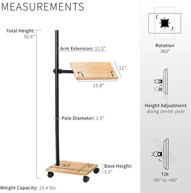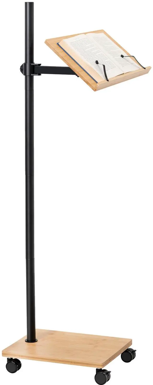 Experience hands-free reading with the Bamboo / Black Mobile Book Stand (CART-BK01B) from VIVO! Spend your reading or study periods in comfort with this stylish rolling lectern. Featuring adjustable page clips, this bamboo stand securely holds your book open to the intended page and keeps it there. The solid wood tray features a raised lip, ideal for holding novels, textbooks, cookbooks, laptops, tablets, cell phones, e-readers, and so much more. The freestanding design makes it easy to use in a variety of settings, and you can find your desired reading angle with tilt, rotation, and height adjustment. All hardware and instructions are provided for easy assembly, so you can enjoy a book stand on wheels in no time!