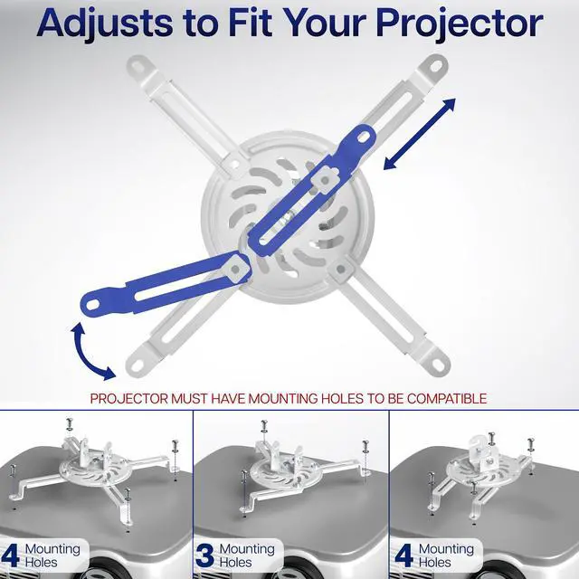 Fits: Designed with adjustable arms to fit most projector brands with mounting ranges from 5.25 to 12.5