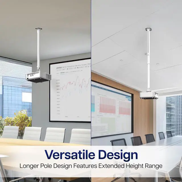 Enhance your visual setup with the White Tall Extending Projector Ceiling Mount (MOUNT-VP03W) from VIVO! Ideal for any home or office, this high-grade steel mount supports up to 29.7 lbs and features customizable viewing height with extension from the ceiling. Adjustable arms fit most projector brands with mounting ranges from 5.25" to 12.5" (with arms). Features include tilt, swivel, and full rotation to maximize projection angles. All hardware and instructions are provided for assembly and installation, so you can get your new projector mount ready to go in no time!