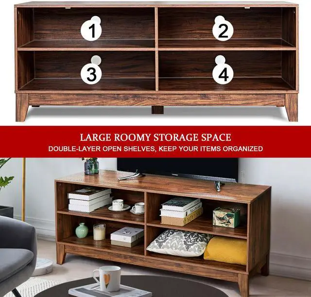 4 open shelves, store books, magazines, home theater system and other media or gaming devices