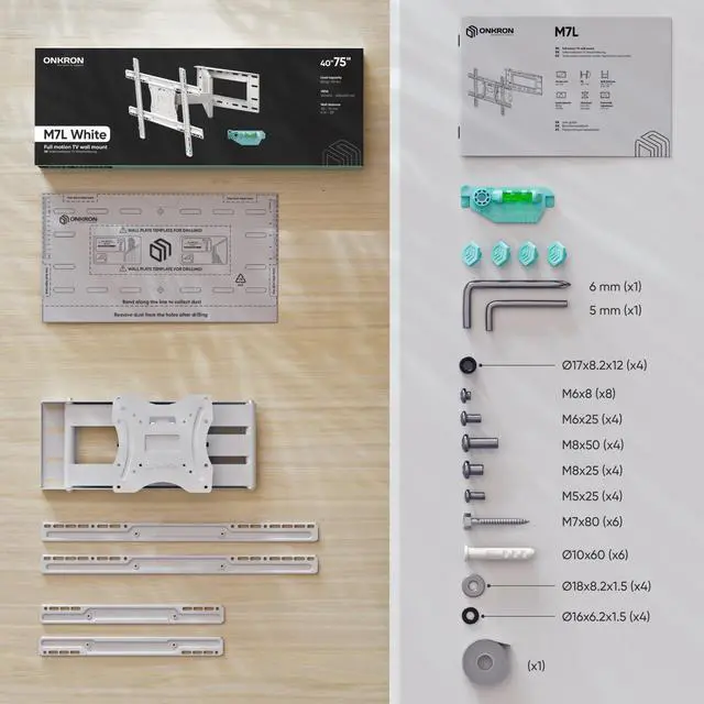 Elegant and stylish, this TV full motion wall mount will fit in any interior. Kit of the wall TV mount swivel includes all necessary fasteners, removable spirit level, mounting template, and assembly manual. Once the TV wall bracket is installed, you can align your TV horizontally. Swivel TV mount wall is made of high-quality steel.