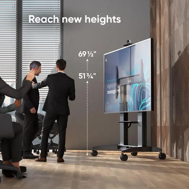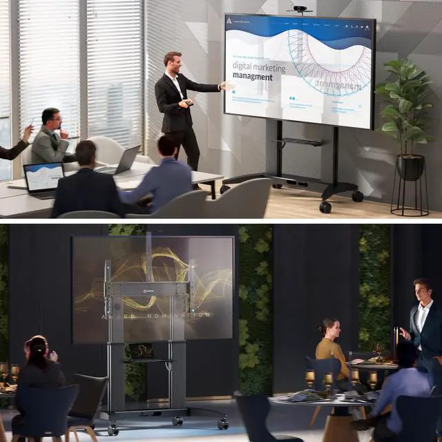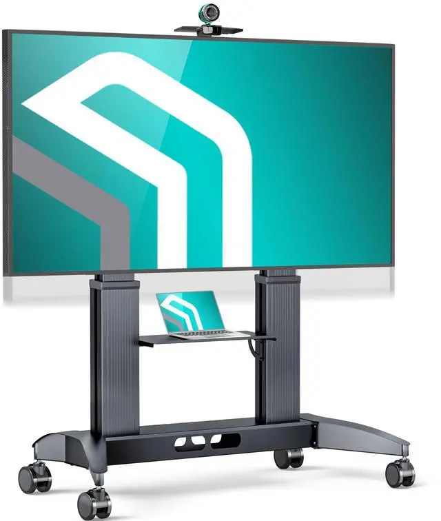 This movable TV stand on wheels fits 200x200 - 1000x600 VESA mounting patterns. Both TVs and interactive panels can be installed on the rollable TV stand.