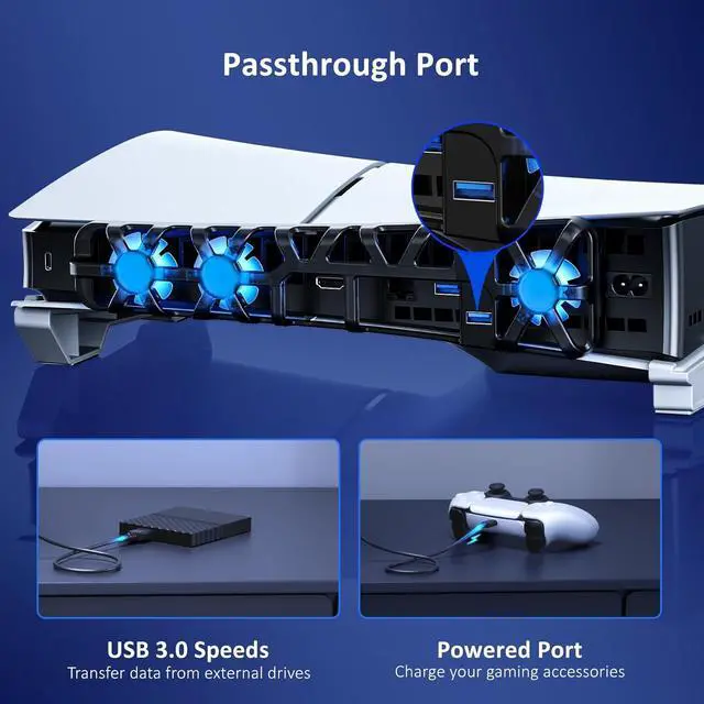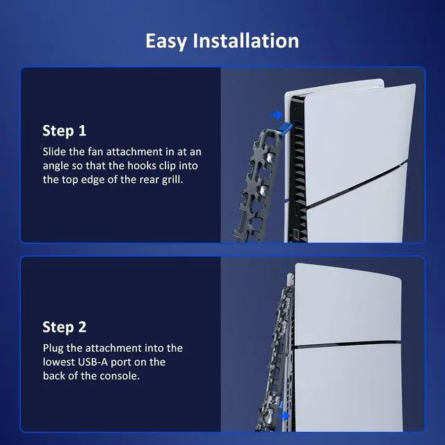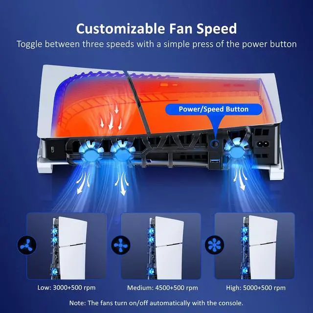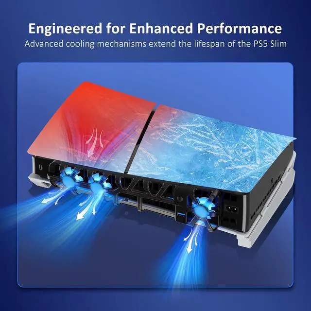 Efficient CoolingWith three fans, this attachment quickly dissipates excess heat from your PlayStation 5 Slim, enhancing longevity and performance. Fans turn off automatically with your console, saving energy post-play.