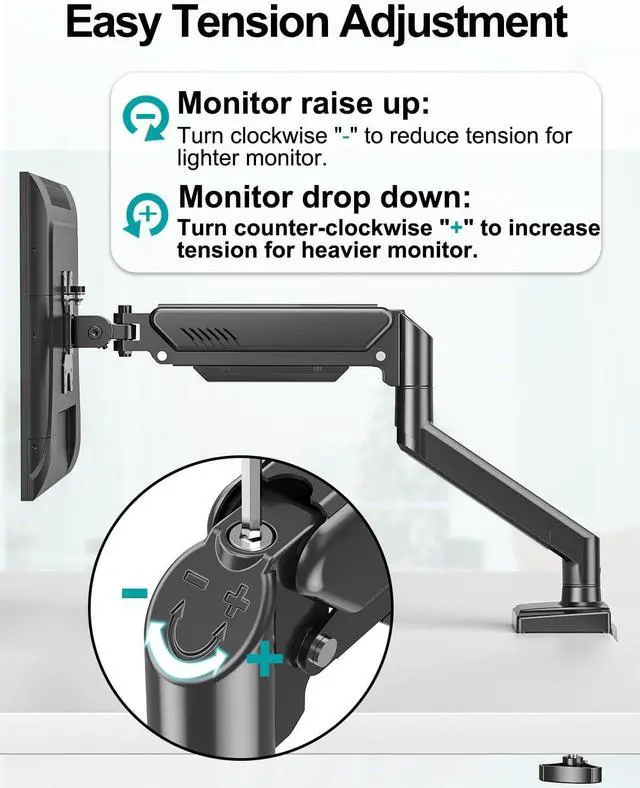 2 Way to Install - The desk mount monitor arm has two desktop installation methods as long as your table thickness is within the 0.39 to 2.76 inch range. You can install it with a C-clamp or grommet mount. No professional help needed, comes with all hardware accessories, less than 15 minutes from opening box to use