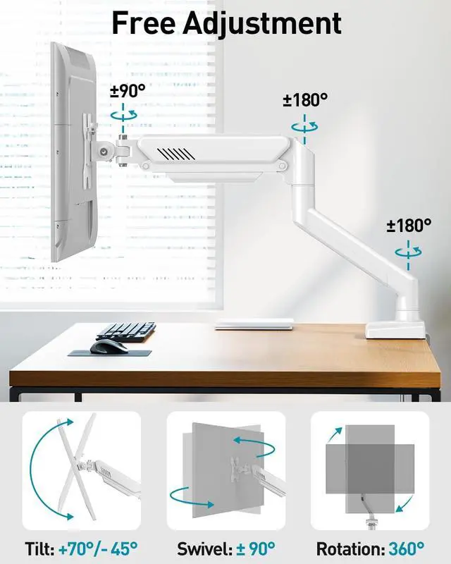 Full Motion Adjustment - The adjustable monitor mount provides a wide range of motion. The monitor arm can tilt up 70° and tilt down 45° , swivel 180°, and the rotate 360° from landscape to portrait setting. Each connection of the arm is adjustable, so you can position your screens freely where you want it or share screen with others