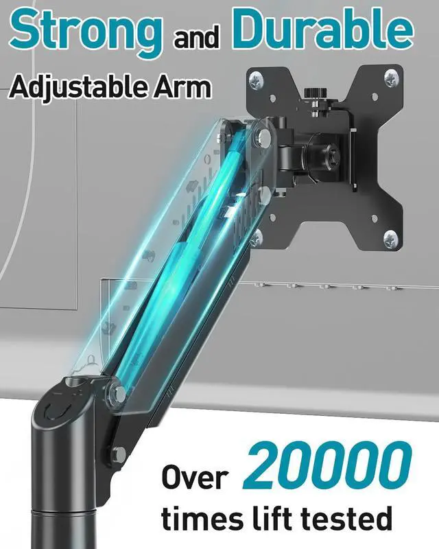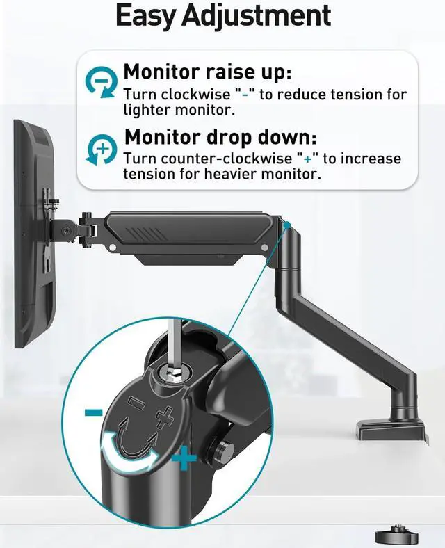2 Way to Install - The desk mount monitor arm has two desktop installation methods as long as your table thickness is within the 0.39 to 2.76 inch range. You can install it with a C-clamp or grommet mount. No professional help needed, comes with all hardware accessories, less than 15 minutes from opening box to use
