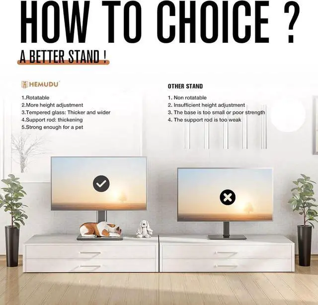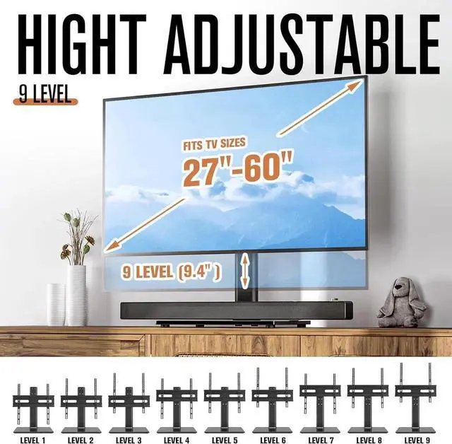 FUNCTIONAL TV STAND WITH HEIGHT ADJUSTABLE AND CABLE MANAGEMENT My functional TV mount have 9 level height adjustment in order to choose your best space, besides integrated cable pass through port and collect the messy cables allows you to tidy your room clean