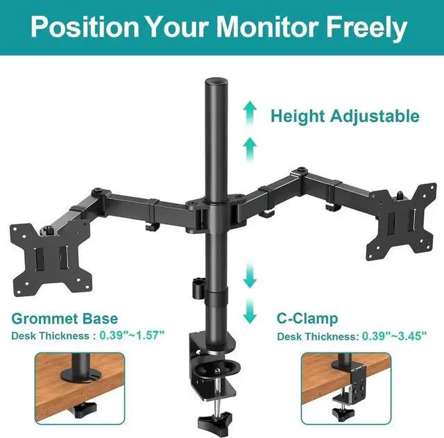 UNIVERSAL COMPATIBILITY - Dual monitor mount widely fits most 13" to 32" flat and curved screens and holds up to 17.6 lbs per arm. Compatible with 75 x 75 mm and 100 x 100 mm VESA pattern. This monitor mount with Clamp and Grommet Base, fits for desk thickness from 0.39 " to 1.97 ".