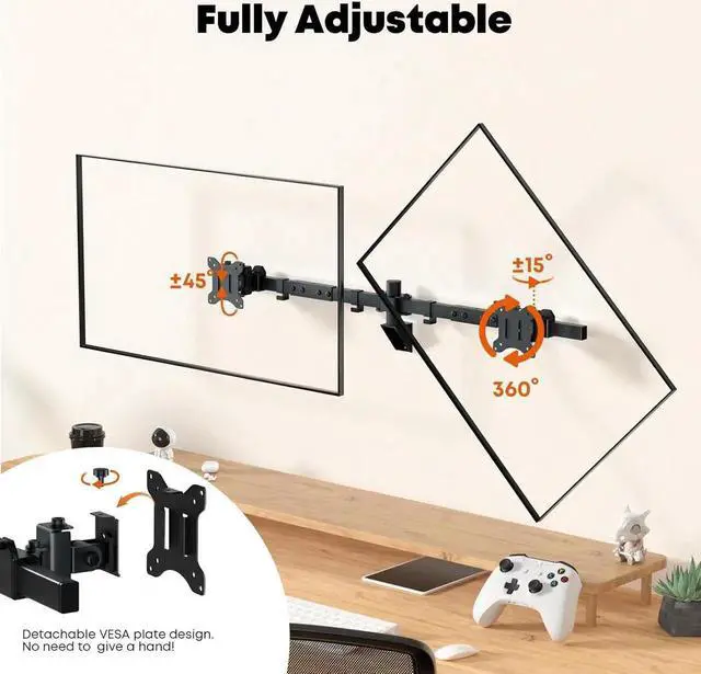 Fully Adjustable: It offers you comfortable viewing angles with +45° to -45° tilt, 180° swivel and 360° rotation adjustments. And monitors can be adjusted in portrait or landscape orientation.