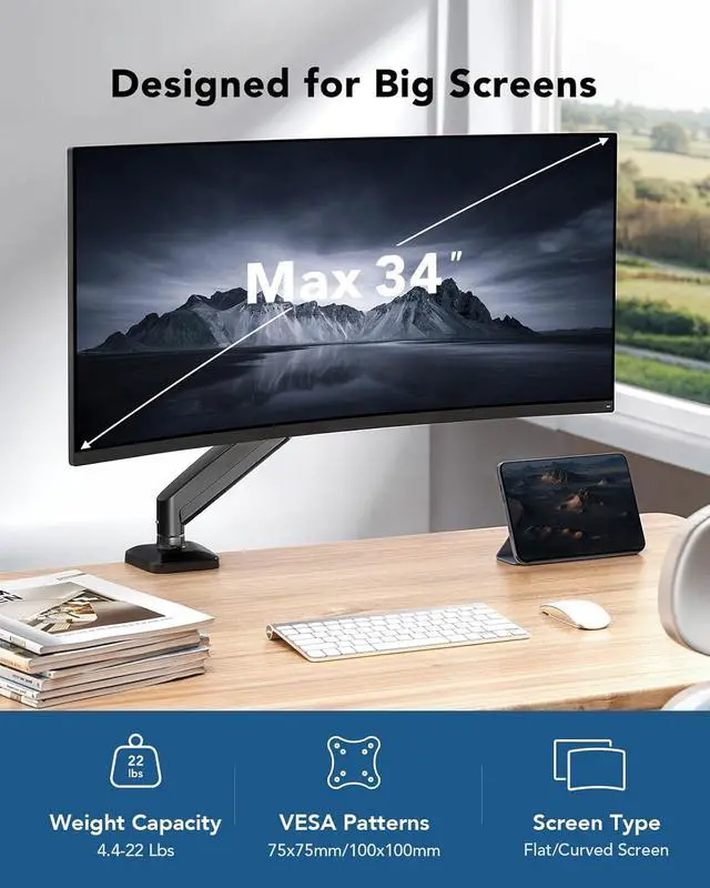 Wide Compatibility: This heavy-duty monitor mount is compatible with most 1334 flat or curved screens weighing up to 22 lbs and supports VESA patterns of 75x75mm or 100x100mm. Its designed for solid wood or metal desks (not suitable for glass surfaces).