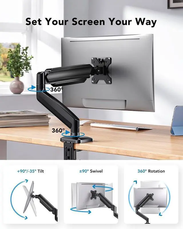 Fully Adjustable Arm: Easily rotate 360° for portrait or landscape modes, tilt +90°/-35° to reduce glare, and swivel ±90° for seamless screen sharing. Enjoy a more flexible work style and a more comfortable gaming experience with this monitor mount for desk.