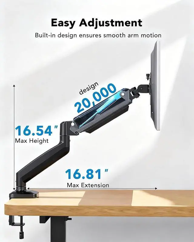 Ergonomic Comfort: This single monitor mount features a gas spring system for smooth adjustments, allowing you to easily adjust the height and extension with just one hand. Extend the arm (up to 16.81) forward and raise it (up to 16.54) to bring the screen closer to your eye level, reducing neck strain and promoting better posture for all-day comfort.
