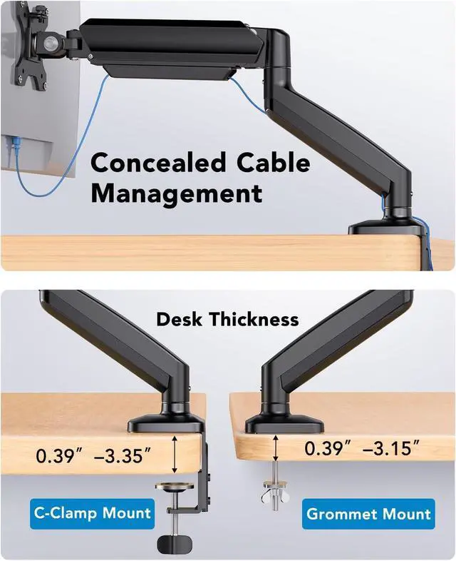 Quick and Hassle-Free Setup: Choose the perfect mounting solution for your deskC-clamp (0.393.35 thick desks) or grommet mount (0.393.15 thick desks). This mount is easy to install with clear instructions. It also features cable management to keep wires organized for a clutter-free workspace.