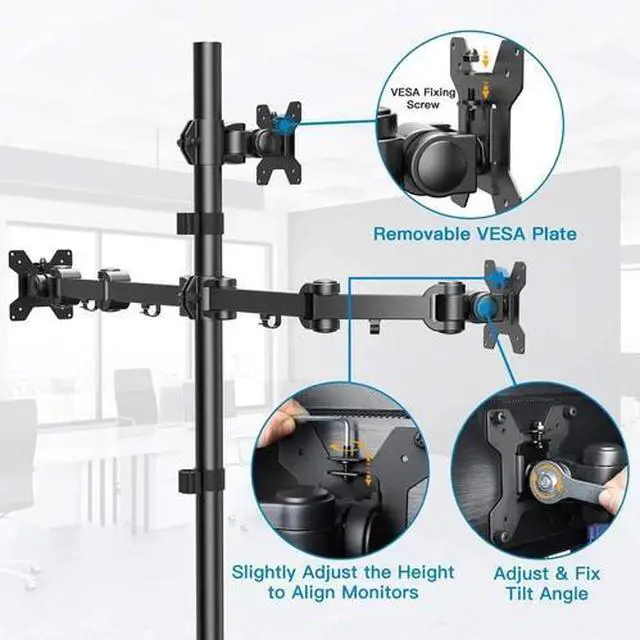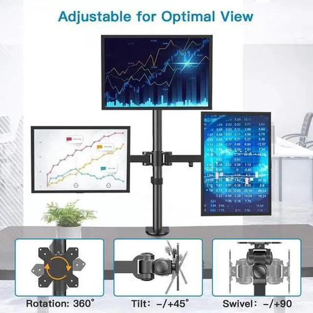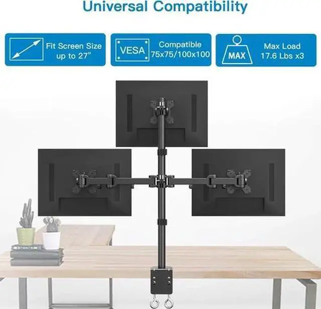 HUANUO Triple Monitor Stand - Free Standing Monitor Desk Mount Fully Adjustable for 3 Computer Screens up to 27 Inch Support Clamp, Grommet Mounting, Heavy Duty VESA Mount Hold up to 17.6lbs Each Arm