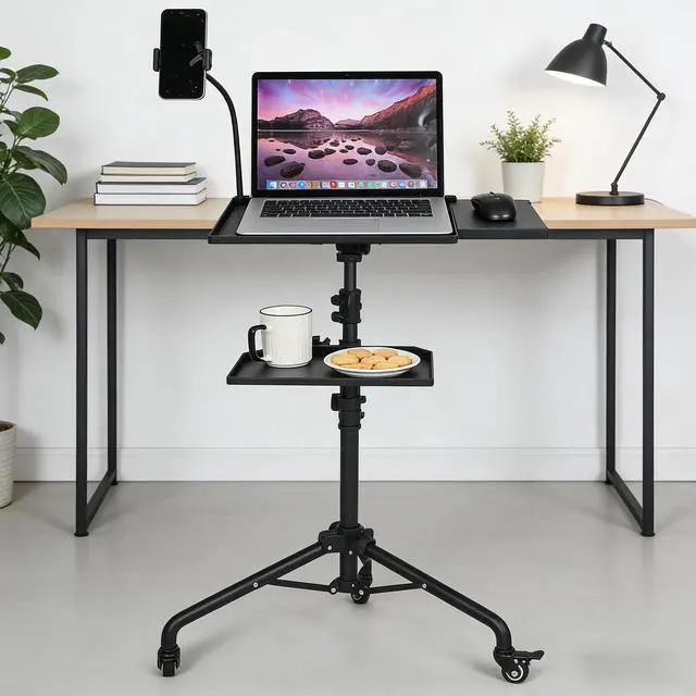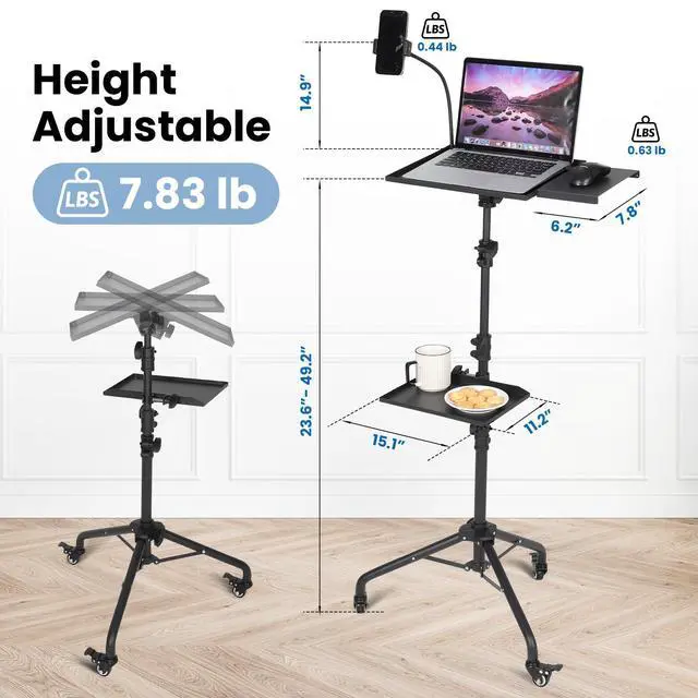 - [Customizable Viewing Experience]-- The height of the laptop tripod stand can be easily adjusted from 23 to 49 inches, catering to your specific needs and preferences. The top tray offers 180° of tilt adjustment, allowing you to find the perfect angle for a comfortable viewing experience. Additionally, it comes with a non-slip cushion and a fixing band to securely hold your projector or laptop in place, preventing any accidental slips or falls.