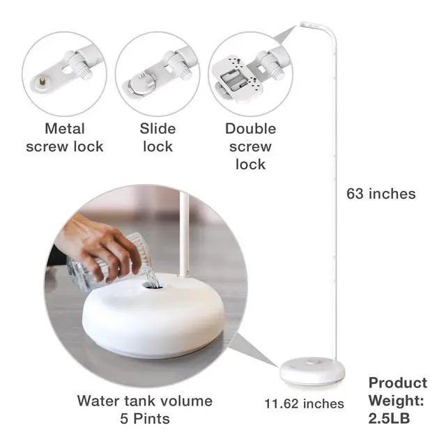The floor stand is flexible and easy to move around. With a durable stainless steel structure with rubber and plastic components, along with a refillable water tank base, the floor stand is secure, sturdy and built to ensure stability while preventing tipping.