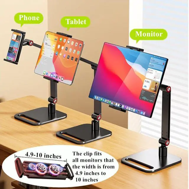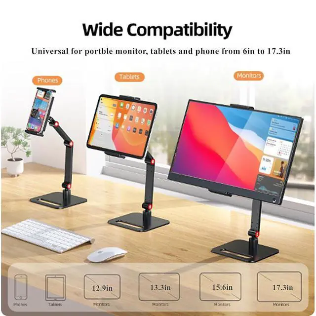 The clip of the monitor stand holder can extend from 4.9 to 10 inch, which can be suitable for phones, tablets, and all portable monitors that screen size are under 17.3 inches.