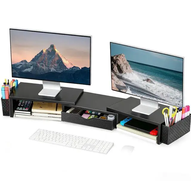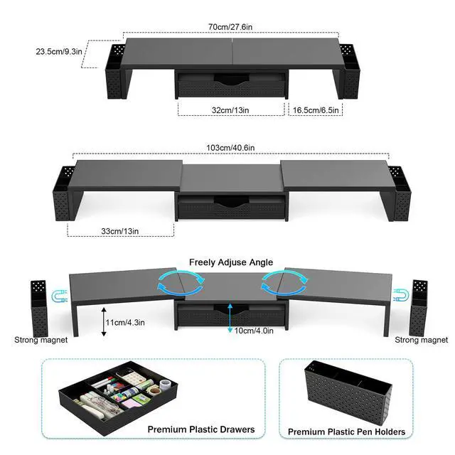 • Dual-screen office efficiency improvement: This desktop organizer is equipped with a dual-display stand, which can place two monitors at the same time, effectively expanding the workspace. It also has adjustable length (27.6-40.6 inches) and angle to provide you with a better viewing experience.
