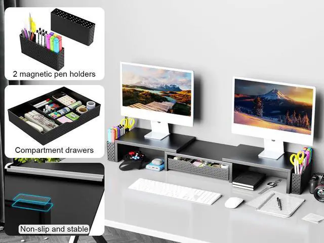 Metal Desk Organizers and Accessories, Dual Monitor Stand Riser with Drawer and 2 Pen Holders, Desk Accessories & Workspace Desktop Organizers for Office Supplies (Black)