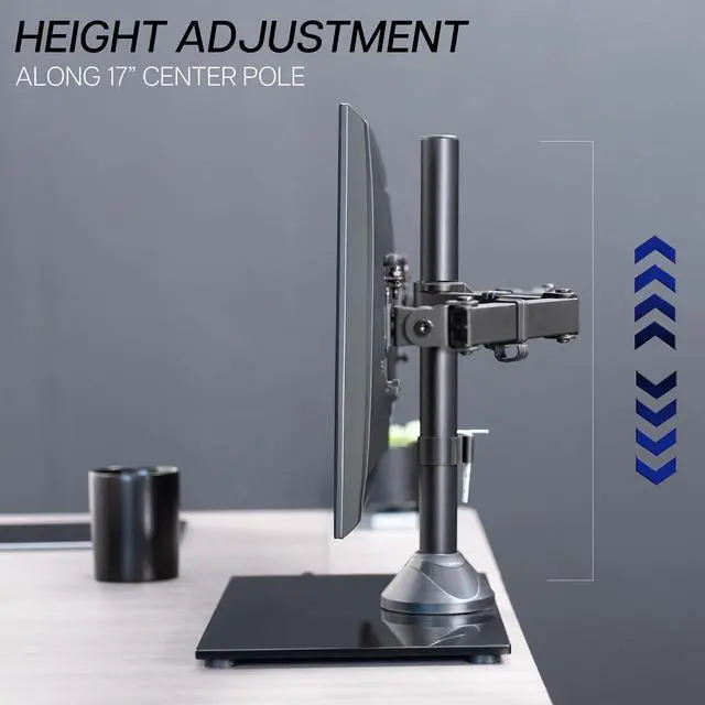 Enhance your work day with this high-grade steel stand built for scratch resistance and security. Designed with user-geared features such as arm articulation, removable VESA mounting plates, adjustable monitor height, integrated cable management, and more. The versatility of screen placement allows for ergonomic viewing aiding in decreased fatigue and muscle strain. The sturdy tempered glass or wood base adds a classy look to your office while providing ample support for the monitors.