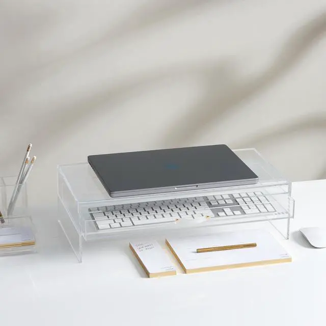 This clear acrylic monitor stand with a storage drawer serves as a practical and stylish organization solution for home and office spaces. Its compact 20" x 10" x 5.25" dimension fits perfectly on standard desks and counters, saving valuable space while keeping your workspace tidy. The stand is constructed from sturdy clear acrylic with polished edges, presenting a modern and elegant appearance that complements any interior decor style. Designed with functionality in mind, it features a built-in drawer to store pens, notes, cables and other small office supplies, allowing you to keep frequently used items accessible. With a weight capacity of up to 10 lbs, it provides reliable and stable support for laptops, monitors and other lightweight devices. Beyond office use, this versatile stand can also be placed on vanities to organize makeup and beauty tools or in pantries for sorting small kitchen supplies. It combines practical storage, sturdy support and aesthetic appeal to create a cleaner, more efficient and visually pleasing environment for work and daily use.