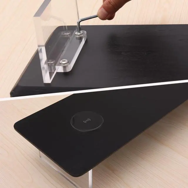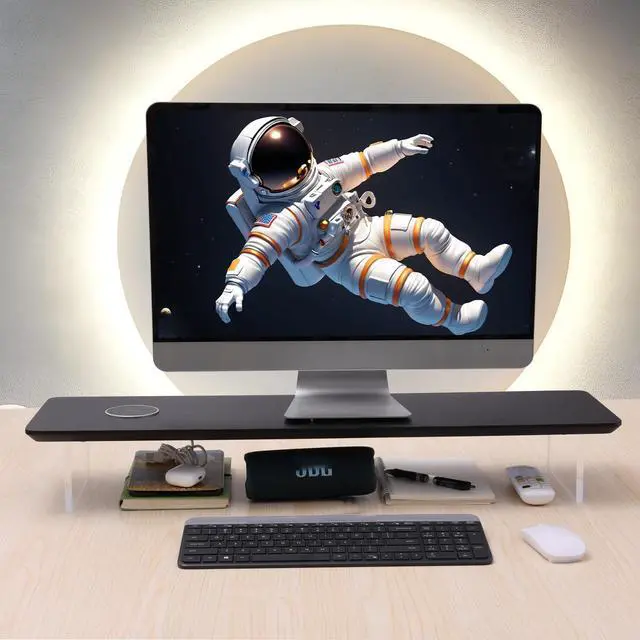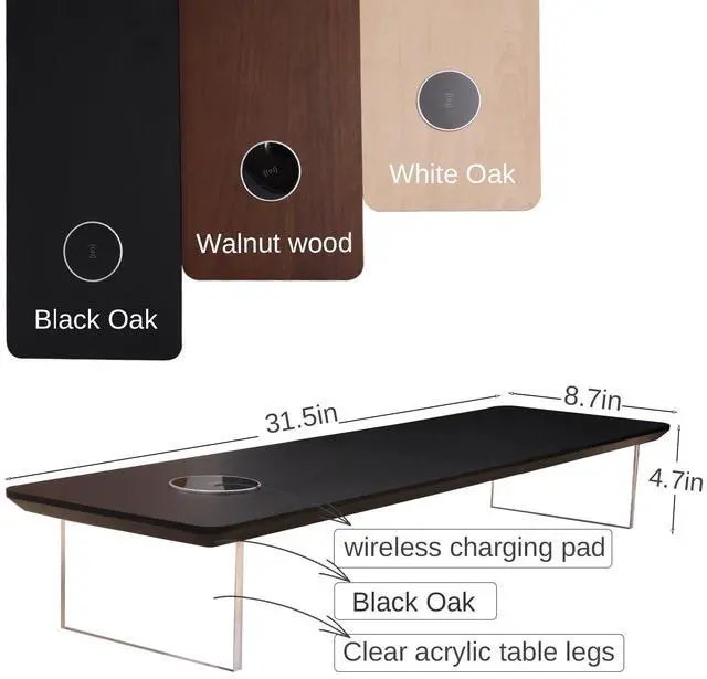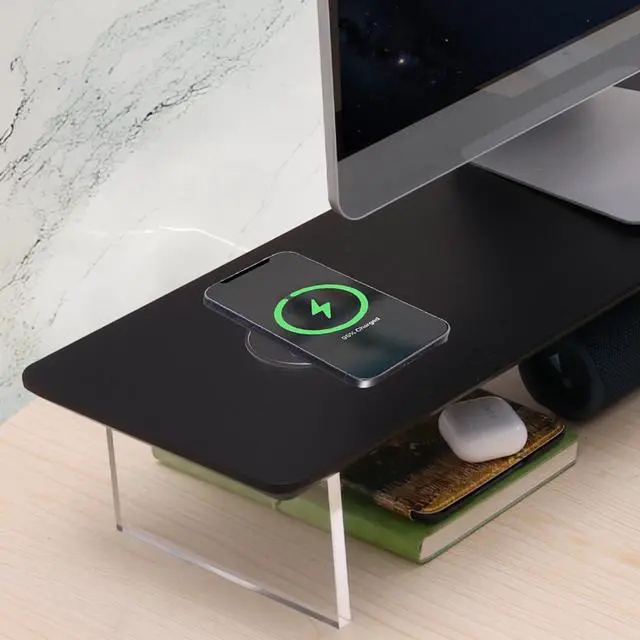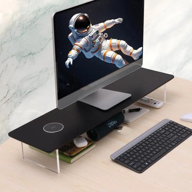| This premium monitor stand blends ergonomic design, wireless convenience and modern aesthetics to upgrade any home or office workspace. Measuring 31.5×9 inches, it provides a spacious platform for monitors up to 32 inches and lifts the screen 4 inches high to reduce neck fatigue and support healthier posture. A built-in 15W wireless charging pad offers cable-free power for compatible smartphones, keeping the desktop tidy. The sturdy high-density wood top and thick transparent acrylic legs form a stable floating structure that holds up to 66 lbs while maintaining an open, light appearance. The elevated design creates valuable under-storage space for keyboards, notebooks and small accessories. Non-slip silicone pads protect furniture and enhance stability. With a sleek black oak finish and minimalist styling, it matches various decor themes. All hardware and illustrated instructions are included for fast, tool-friendly assembly in just five minutes. Ideal for professionals, gamers and remote workers, this stand combines functionality, comfort and visual appeal for daily use. |