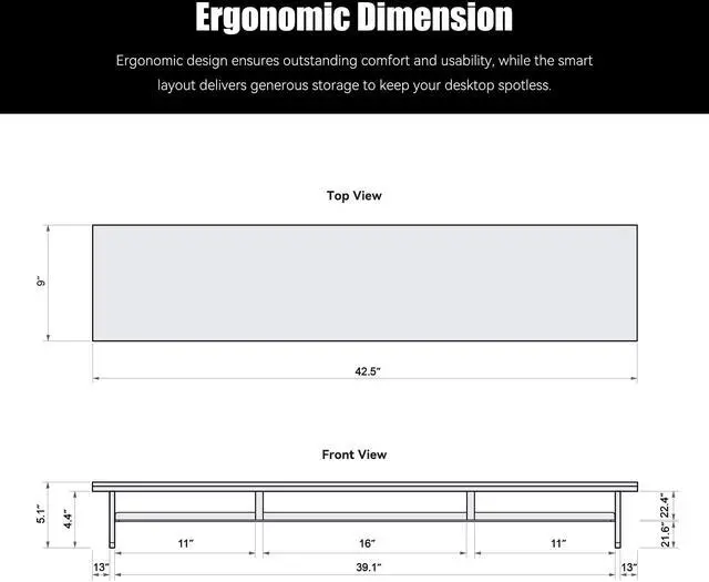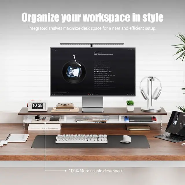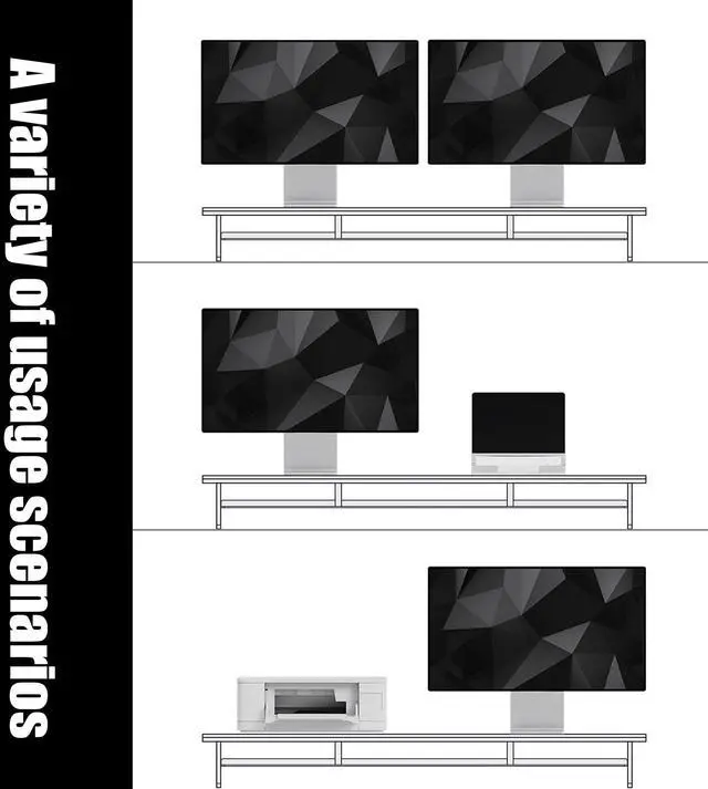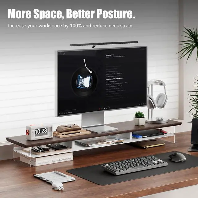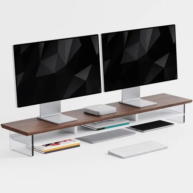 | This dual-tier monitor stand riser is designed to upgrade any home or office desk with functional style and reliable support. The transparent acrylic legs create a modern floating effect that adds a clean, minimalist look to your workspace, while also allowing for ambient lighting customization to suit different moods and uses. The stand is constructed with a thickened 0.7-inch panel reinforced with a steel core, ensuring strong stability and a maximum load capacity of 66 lbs, making it suitable for most laptops, monitors, and other desk essentials. Standing at 5.1 inches high, it elevates your screen to an ergonomic level that helps reduce neck fatigue and improve posture during long working or gaming hours. The thoughtful double-layer storage system divides space into three small upper sections and one large lower compartment, providing plenty of room to store pens, notebooks, cables, and small office supplies to eliminate desk clutter. The unit comes with a user-friendly setup process, featuring pre-drilled holes and pre-assembled drawers that allow for quick installation in about 15 minutes without complicated tools or steps. Its rectangular shape and polished finish blend well with various desk setups, offering both practical organization and visual appeal for daily use. |