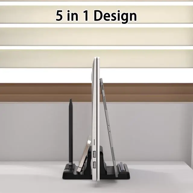 High-Quality: This stand is made of high-quality ABS plastic and is compatible with various laptops, Suitable for MacBook/Surface/Samsung/HP/Dell/Chrome Book. In addition to accommodating laptops, the stand also comes with additional slots for tablets, phones, or other accessories.