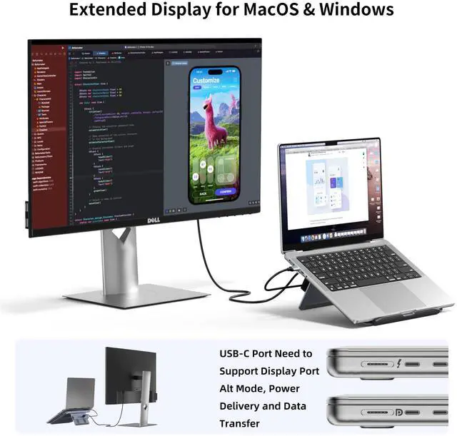 By connecting via your laptop’s USB-C port, the LORYI docking stand lets you add an external HDMI display at up to 4K@60Hz (3840x2160). It supports both mirrored and extended display modes